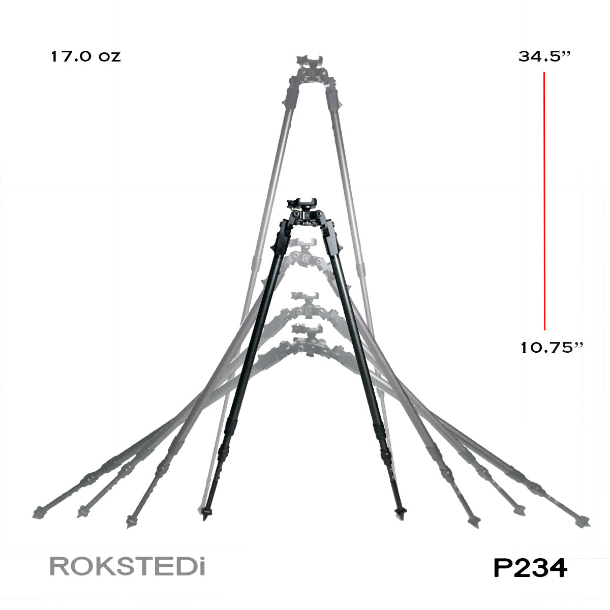 The P234 Bipod adjusts from a 10.75" prone position all the way to a 34.5" seated & kneeling position, which is perfect for the more serious hunter in the 6 foot tall range. With 23.75 inches of vertical travel & coming in at just 17 ounces, it's versitality, weight & stability are unmatched in the hunting bipod world.